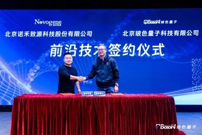 玻色量子首创东说念主兼COO马寅(右)与诺禾致源首席科学家田仕林签署前沿期间相助条约