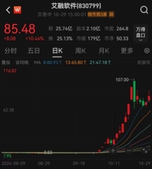 10月22日,艾融软件惯性上冲大涨率先10%,一度摸至107元/股历史高点,关联词随后却一会儿跳水,从107元/股位置直线下杀,在短短一分钟时刻内被砸至68.24元/股的跌停板,股价巨震近40%。当日截止收盘艾融软件大跌20.7%,报77.29元/股。随后,艾融软件股价不休调治,放纵当天收盘报85.48元/股,恒久未能翻过10倍高点。