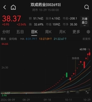 放纵收盘,双城药业高潮2.54%,报38.37元/股,成交率先51.74亿元,本体换手率达到64.11%。值得夺主义是,在当天盘中双城药业一度大涨率先9.5%,最高波及40.98元/股,较2024年7月25日4元低点,股价翻十倍,成为A股主板年内首个10倍牛股。