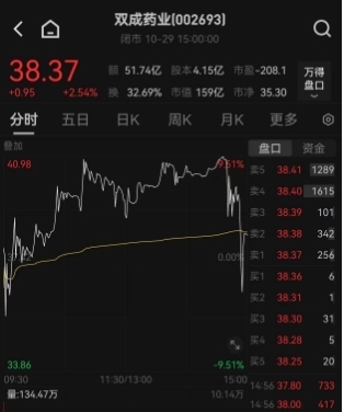 29日邻近尾盘,双城药业向着28天25板发起冲击,一度大涨率先9.5%,距离涨停只是一步之遥,关联词在邻近收盘的20分钟却风浪突变,双城药业从14点40分起一会儿掉头向下,甚而一度翻绿。