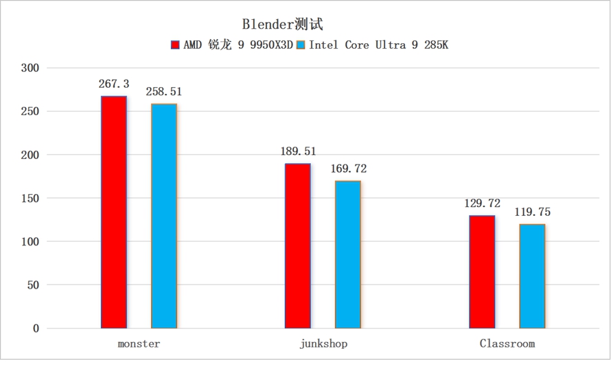Blender亦然一款十分流行的渲染软件,这款软件也被诸多视频从业者所平时使用,通过三个场景的画面渲染,咱们不错看到AMD锐龙 9 9950X3D科罚器领有非常进程的上风,昭着在渲染推崇上愈加出色。