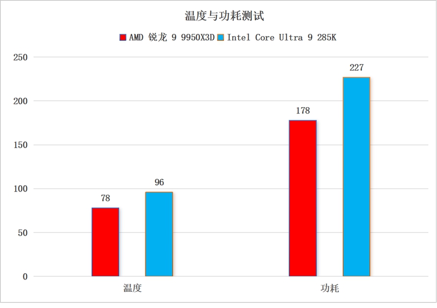 咱们相通使用AIDA 64进行FPU拷机测试,发现不管是温度如故功耗,AMD锐龙9 9950X3D科罚器齐远胜Intel Core Ultra 9 285K,温度下跌了18摄氏度,同期咱们也发现这个功耗比较较AMD锐龙9 9950X还有所越过,与Intel Core Ultra 9 285K比较简短低了50W,昭着关于用户来说,更低的发热量以及功耗意味着不错在散热器以及电源上减少过问,从而裁汰全体的预算。