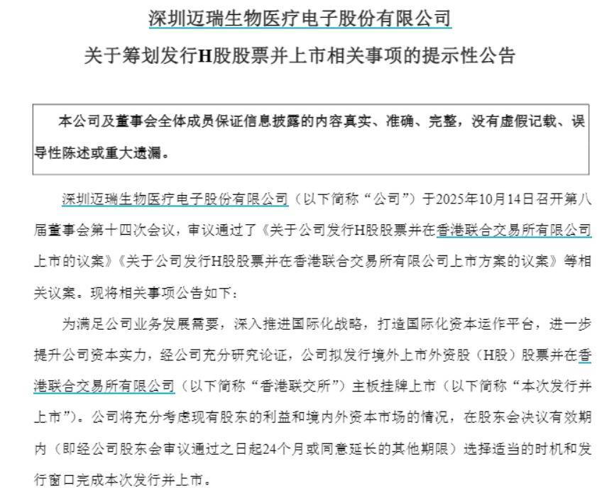 【大河财立方讯息】10月14日,深圳迈瑞生物医疗电子股份有限公司(证券简称迈瑞医疗)发布公告称,拟刊行境外上市外资股(H股)股票并在香港联交所主板挂牌上市。
