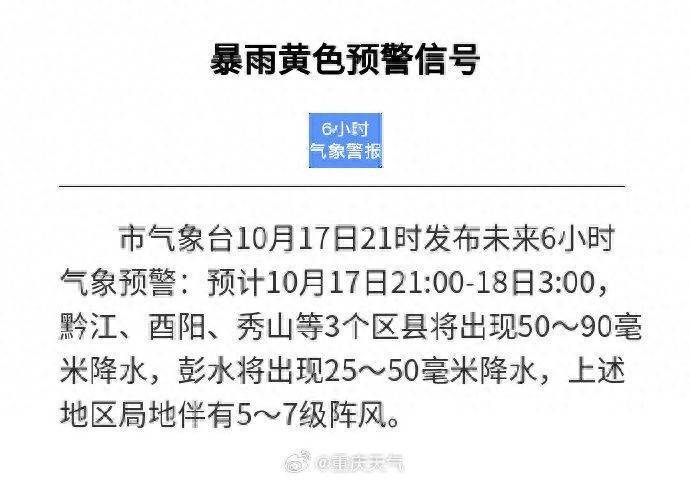 重庆市局势台10月17日21时发布暴雨黄色预警信号云开体育。