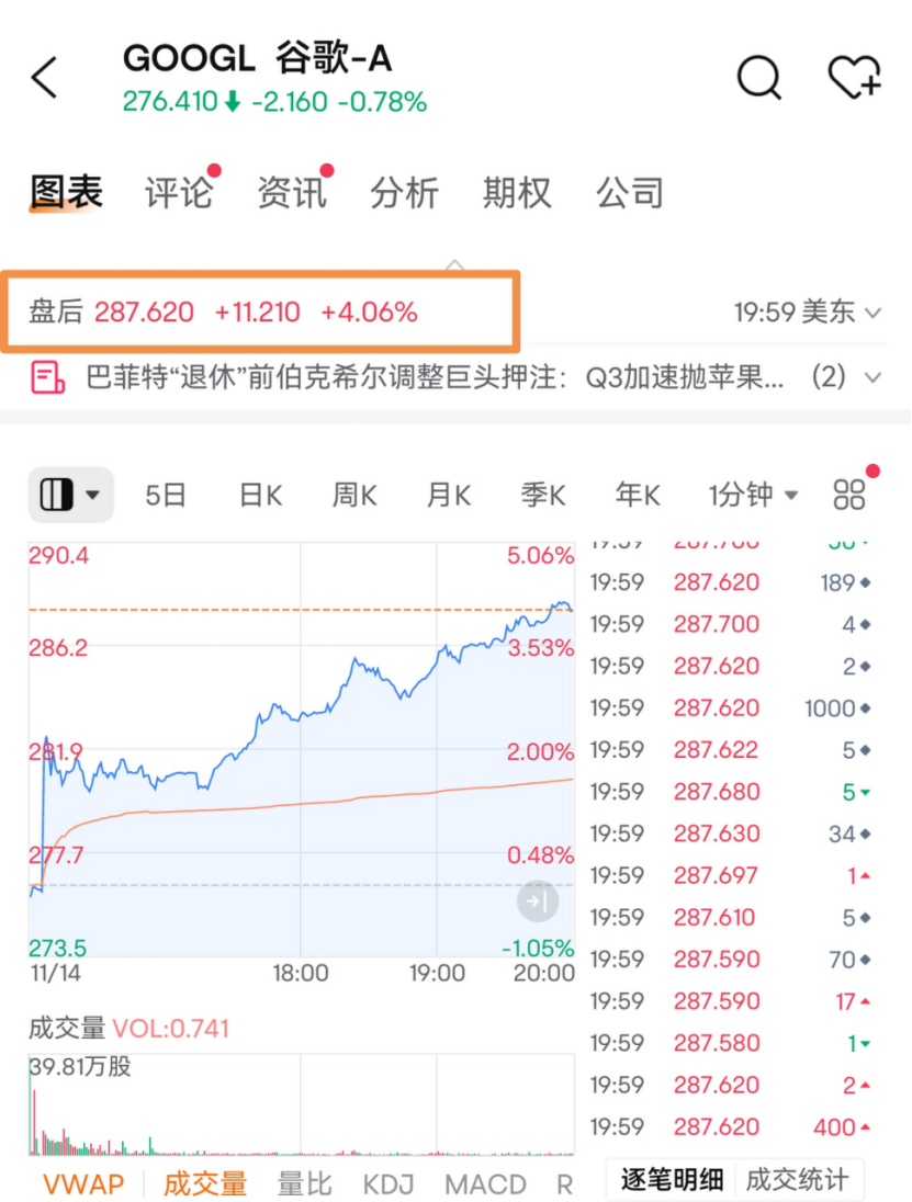 阐述领路,第三季度,伯克希尔买入谷歌母公司Alphabet股票。具体来看,伯克希尔在第三季度买入了1790万股Alphabet股票。戒指周五收盘,这些股份市值约为49亿好意思元。上述音问公布后,Alphabet股价在好意思股盘后交游中高涨4.06%,报287.62好意思元。若是下周一开盘后保管这一涨势,Alphabet单日市值将增长超1300亿好意思元。